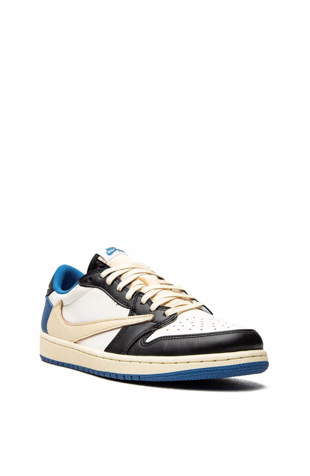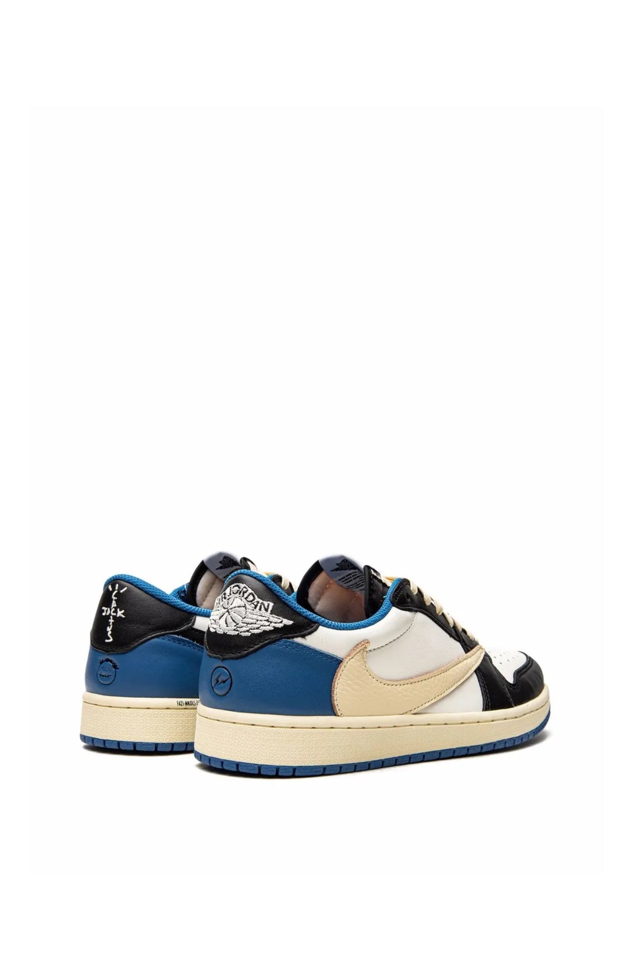 These AJ1s have been created in collaboration with Jordan, American rapper Travis Scott and Hiroshi Fujiwara's Fragment Design. They're crafted from panels of white, black and blue leather and set apart by a collection of logos. Travis' inverted Swoosh details the sides while the Cactus Jack branding and the iconic double lightning motif are etched into the left and right heels accordingly. Ever present, the Wings Insignia lends them a final stamp of identity.